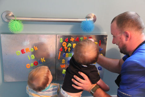 One corner of the room is a play area, outfitted with blue rubber floor matting, magnetic wall tiles and a grab bar to help Derek pull himself up and build upper body strength.
