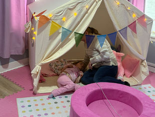 A Room to Heal created a space for Aria, and her 2 older sister, to receive therapies and a space where Aria can continue to heal. Storage solutions were added to keep the room organized, foam floor tiles add to the safety of the space. Modular furniture can be used for both sitting or playing. Many sensory item were added: a bubble tube, wall lights that change colors, a mirror with LED color-changing lights, a tent, a weighted/vibrating pillow, and a weighted Stitch. Princess wall decals and cozy rugs finished off the space.