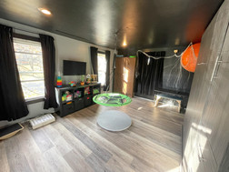 The ceiling in Emmy’s therapy space and bedroom was painted black. This allows her to focus on viewing objects easier because of the black background. A Murphy bed was installed that allows a caregiver to sleep close by without taking up needed space. In the center of her therapy room, a swing was installed. Black curtains block out light so she can view her fiber optic lights and bubble tube. New flooring was installed, and shelving and storage was added.