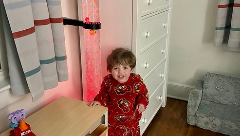 Noah LOVES the movie Cars, so that became the theme for his room. A large wallpaper mural is the main feature in the space. We added a cabinet with colorful storage to help keep his medical supplies organized. Heavy duty shelving in his closet holds the heavy boxes of dialysis supplies. A washable rug, washable chair cover, and white changing pad covers (that can be bleached) will help keep his room clean. We mounted his tv on the wall and added a footstool so his parents can be comfortable while holding and rocking him during dialysis. Toy storage and a bubble tube add some “fun.”