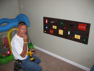 With ideas from Scott's physical and speech therapists, A Room to Heal was able to provide Scott with a safe healing environment where he can play, work on his physical strength, and practice his communication while at home. Scott's new room includes soft rope lighting, a ceiling fan and window air conditioner to control temperature, and a special velcro board to help Scott maintain his vocabulary. A busy board with light switches, buttons (Scott's favorite!), and knobs keeps Scott occupied and distracted from the real ones! A soothing fish tank set up high ads to the calming effect of the room, along with a television mounted with cords (another of Scott's favorites) well out of reach.
